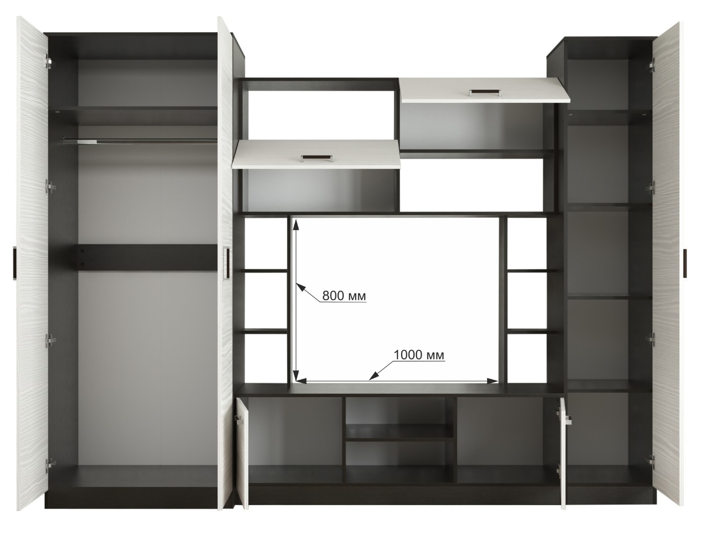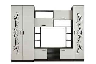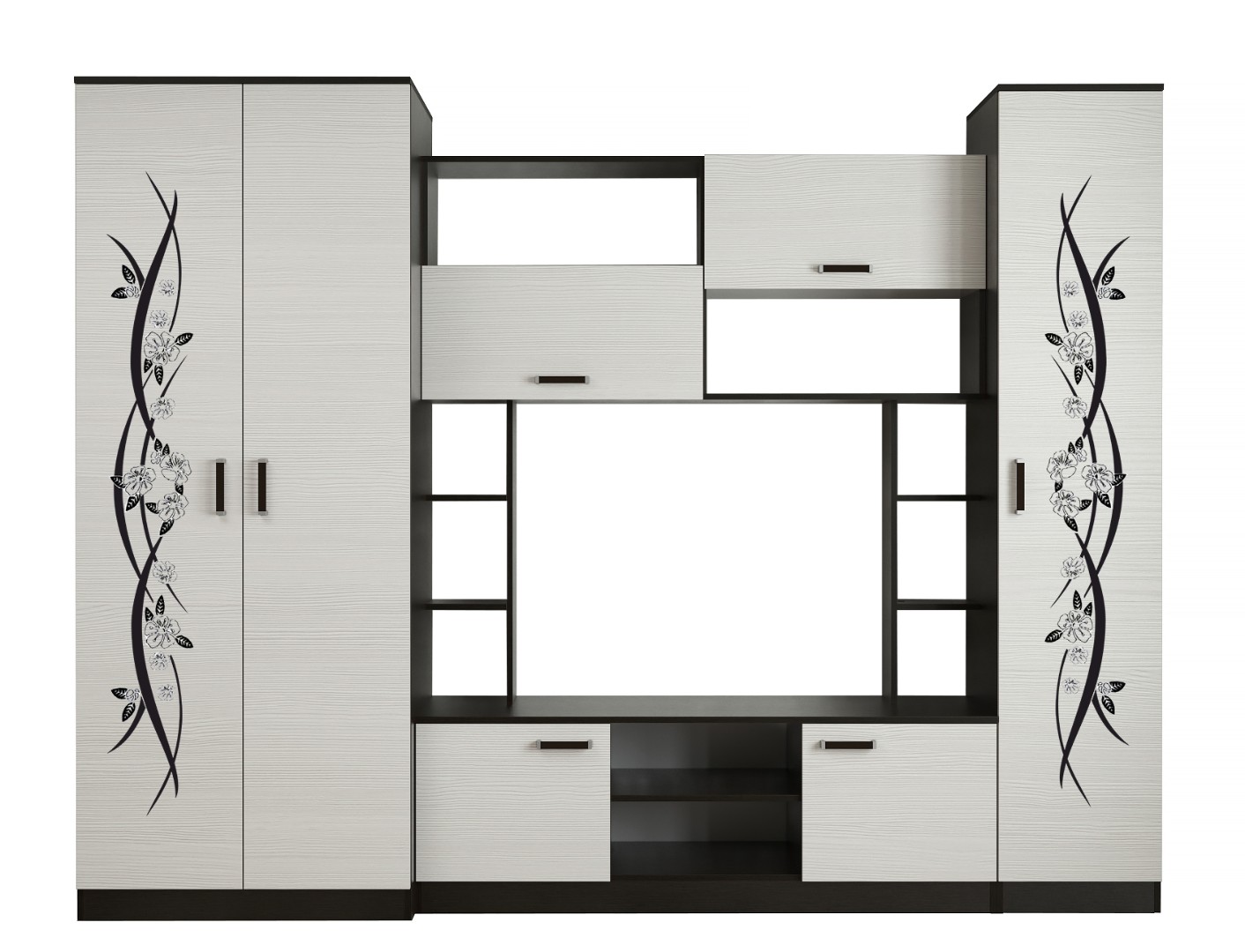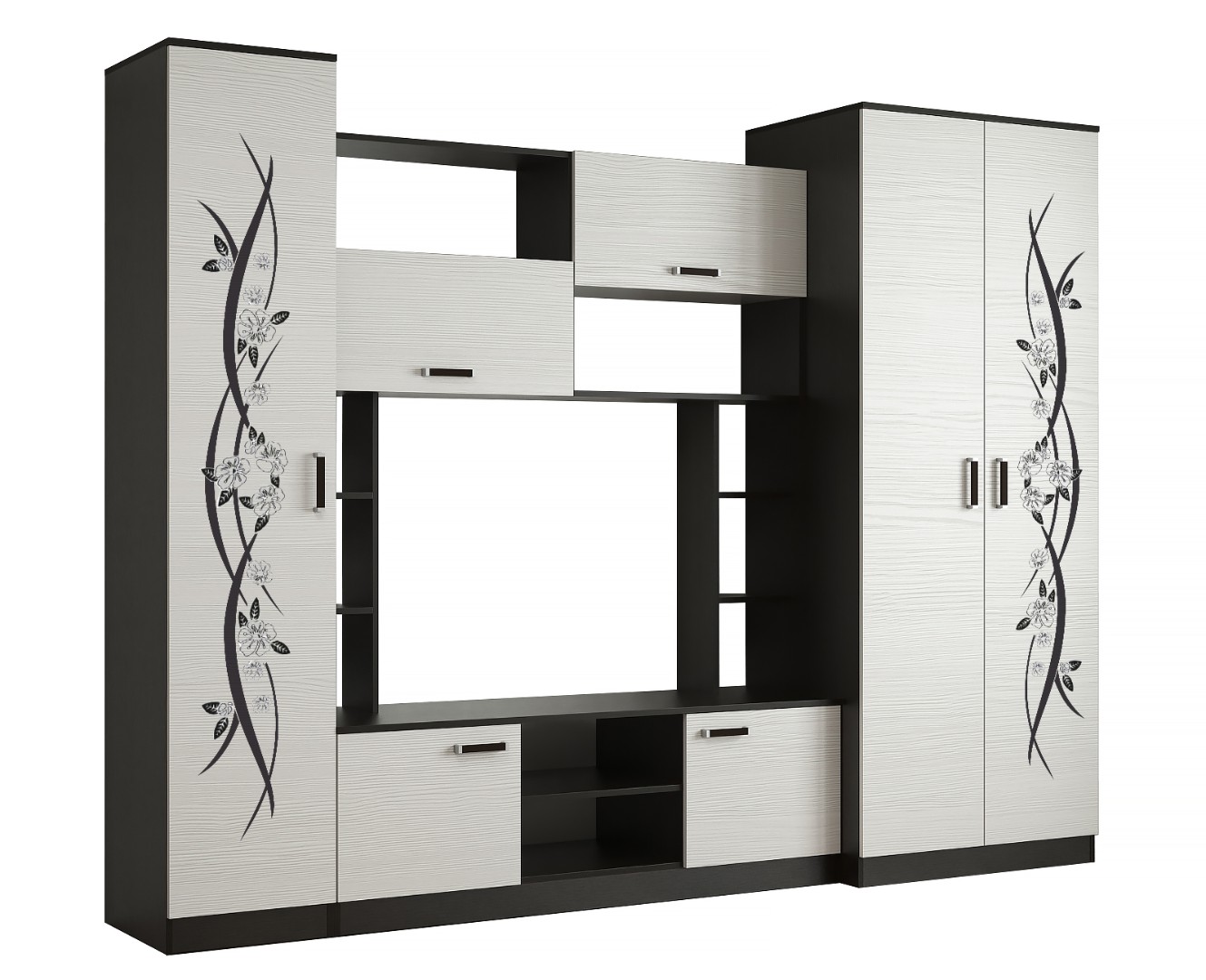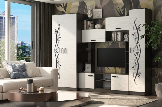 Стенка «Престиж» с нанесенным рисунком по технологии УФ (ультрафиолетовая) печать. Стильная стенка для гостиной длиной 2,7 метра. Корпуса и фасады изготавливаются ил ЛДСП, темный корпус с текстурой дуба венге, светлые фасады с текстурой бодега. Правая и левая секции шкафа взаимозаменяемые!