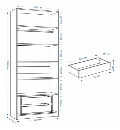 2 ящика выдвижных, 2 штанги, 5 полок |