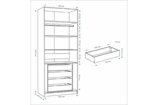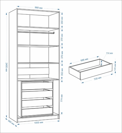 4 ящика выдвижных, 1 штанга, 4 полки |