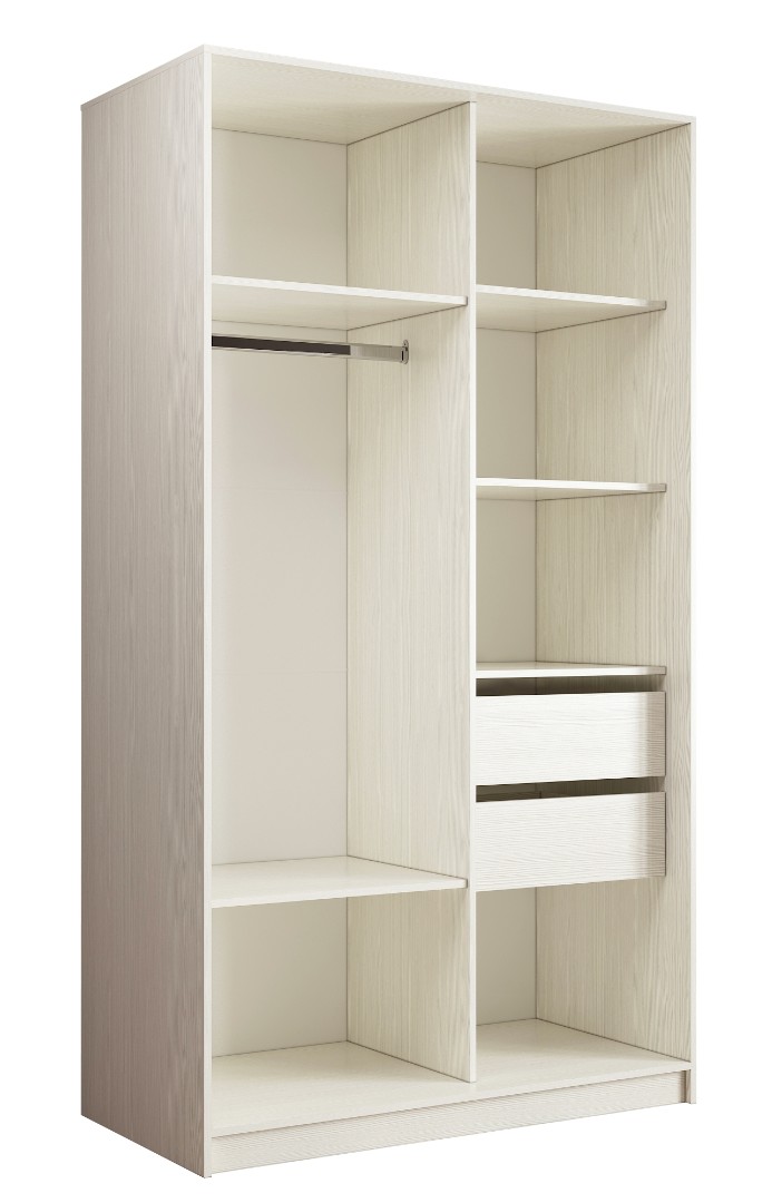 Стандартная глубина шкафа в 60 см позволяет разместить одежду на плечиках без помех для открытия раздвижных дверей, а полки создают вместительные ниши для крупных вещей, таких как постельное бельё, пледы, одеяла и подушки.