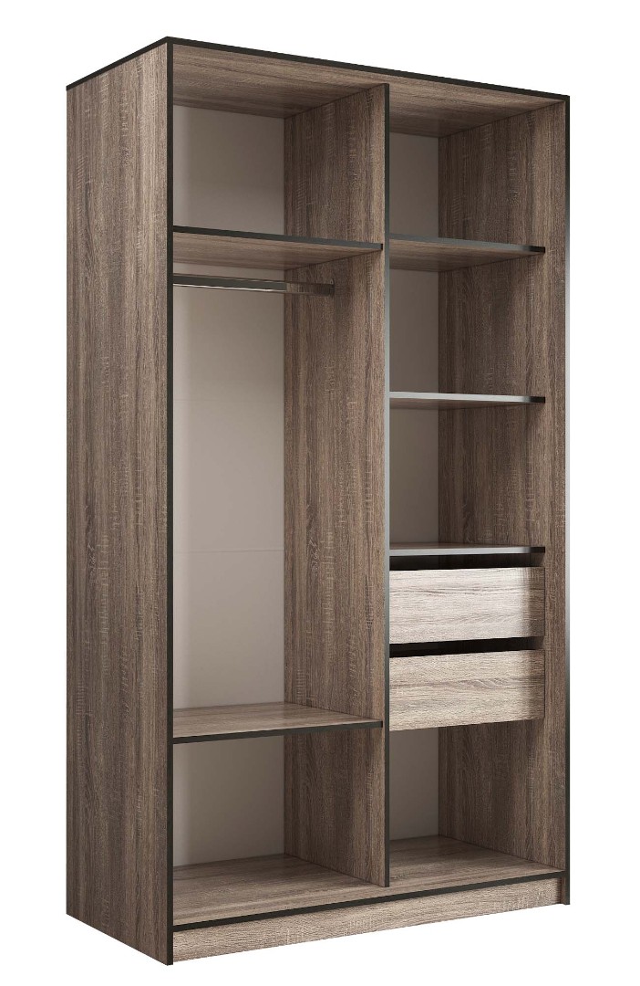 Стандартная глубина шкафа в 60 см позволяет разместить одежду на плечиках без помех для открытия раздвижных дверей, а полки создают вместительные ниши для крупных вещей, таких как постельное бельё, пледы, одеяла и подушки.