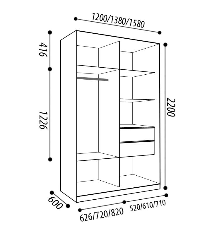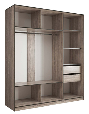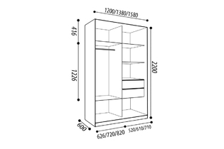 Стандартная глубина шкафа в 60 см позволяет разместить одежду на плечиках без помех для открытия раздвижных дверей, а полки создают вместительные ниши для крупных вещей, таких как постельное бельё, пледы, одеяла и подушки.