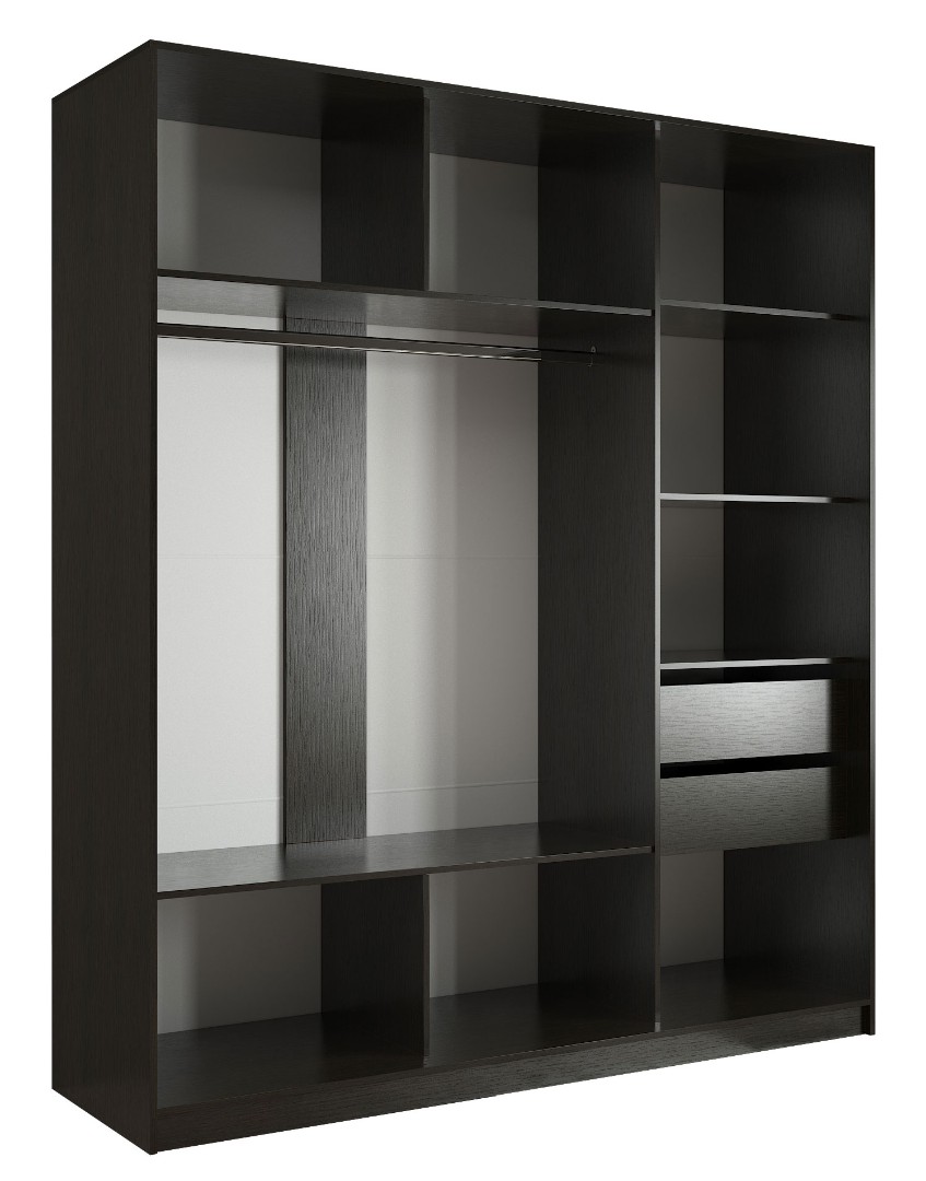 Стандартная глубина шкафа в 60 см позволяет разместить одежду на плечиках без помех для открытия раздвижных дверей, а полки создают вместительные ниши для крупных вещей, таких как постельное бельё, пледы, одеяла и подушки.