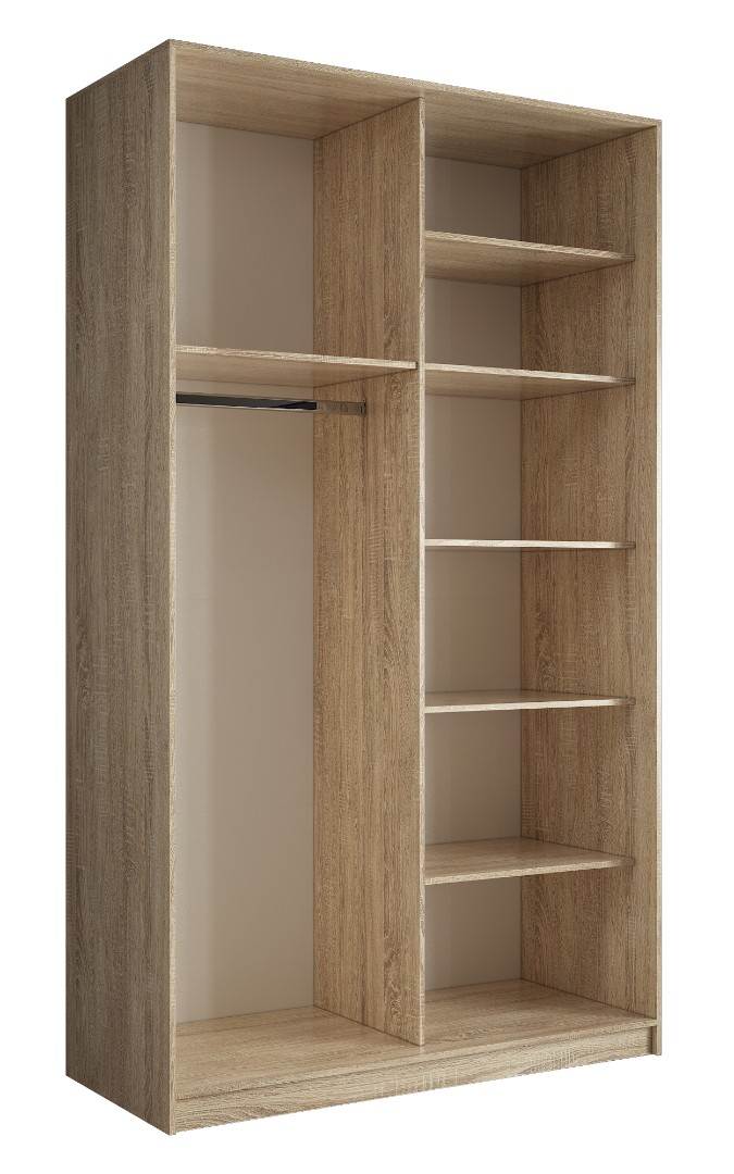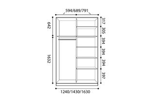 Левая секции оснащена полкой и горизонтальной штангой для вешалок, расположенными в верхней части секции. Под штангой есть достаточно места для хранения более длинной одежды, такой как платья и пальто.