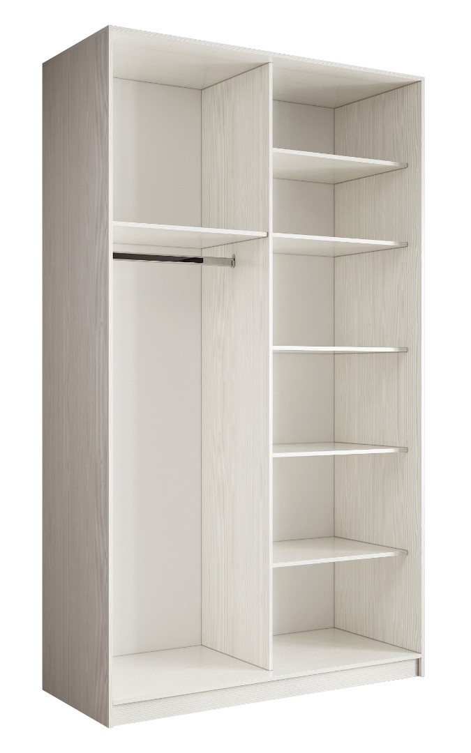 Стандартная глубина шкафа-купе в 60 см позволяет разместить одежду на плечиках без помех для открытия раздвижных дверей, а полки создают вместительные ниши для крупных вещей, таких как постельное бельё, пледы, одеяла и подушки.