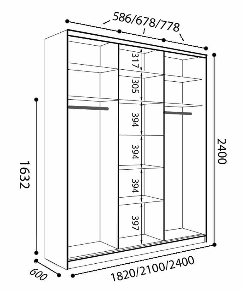 Стандартная глубина шкафа-купе в 60 см позволяет разместить одежду на плечиках без помех для открытия раздвижных дверей, а полки создают вместительные ниши для крупных вещей, таких как постельное бельё, пледы, одеяла и подушки.