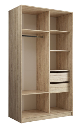 Стандартная глубина шкафа в 60 см позволяет разместить одежду на плечиках без помех для открытия раздвижных дверей, а полки создают вместительные ниши для крупных вещей, таких как постельное бельё, пледы, одеяла и подушки.