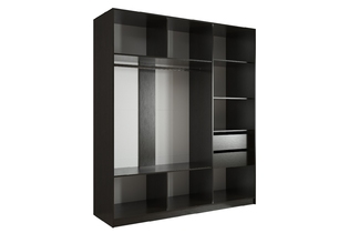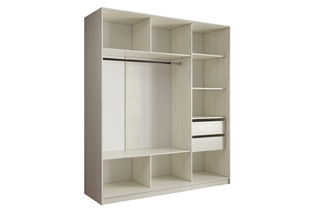 Стандартная глубина шкафа в 60 см позволяет разместить одежду на плечиках без помех для открытия раздвижных дверей, а полки создают вместительные ниши для крупных вещей, таких как постельное бельё, пледы, одеяла и подушки.
