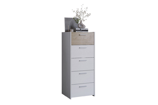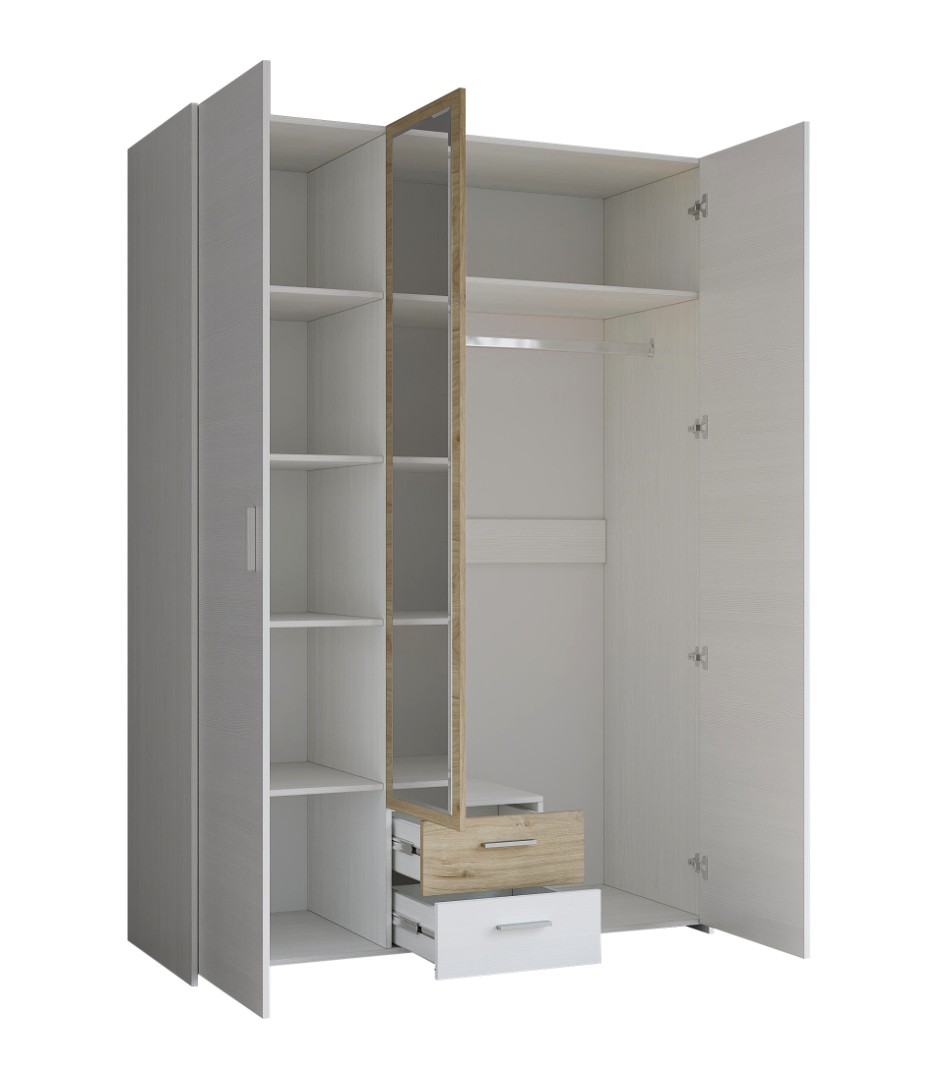 В цветовой палитре преобладают светлые, нейтральные тона: белый ЛДСП (Бодега белый) для основной части мебели. В качестве акцента используется светлое дерево (Гикори Кингстон). Это добавляет теплоты и уюта интерьеру.